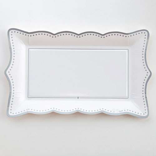 La bandeja rectangular Grace está fabricada en cartón rígido color banco. Decoradas con un filo color metalizado en el borde. Ideal para presentar aperitivos o pastelitos. Tiene unas dimensiones de 30 x 18 cm. Disponible en color plata. Perfecta para las celebraciones navideñas y aniversarios de adultos. Muy elegante. Se vende en packs de 4 unidades. Diseño italiano
