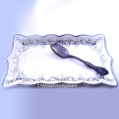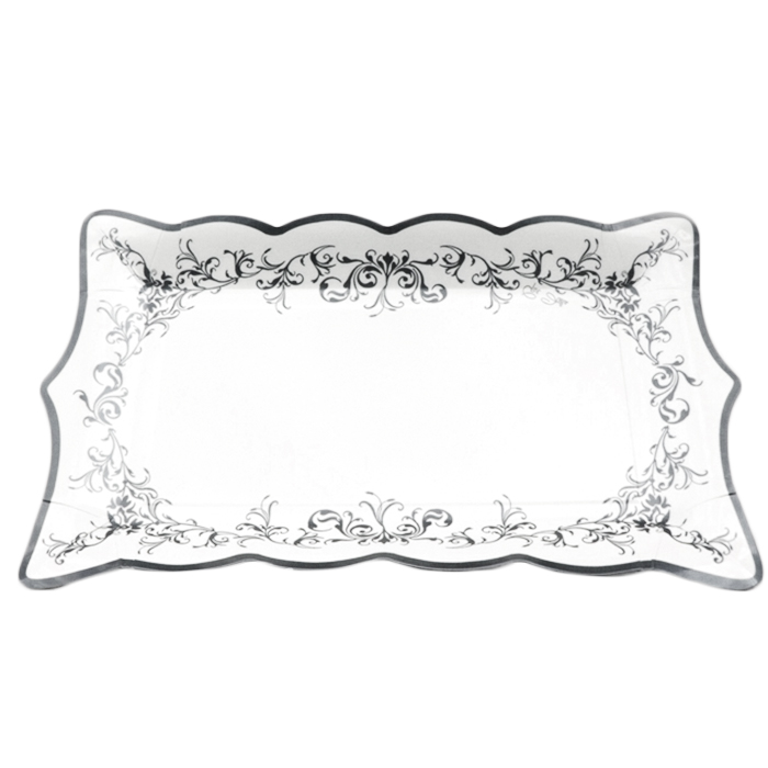 Bandeja rectangular imperio fabricada en cartón rígido decorado. Es perfecta para presentar aperitivos o pastelitos. Tiene unas dimensiones de 30 x 18 cm. Disponible en color plata. Existen platos a juego, llano y de postre. Se vende en paquetes de 4 unidades. Diseño italiano