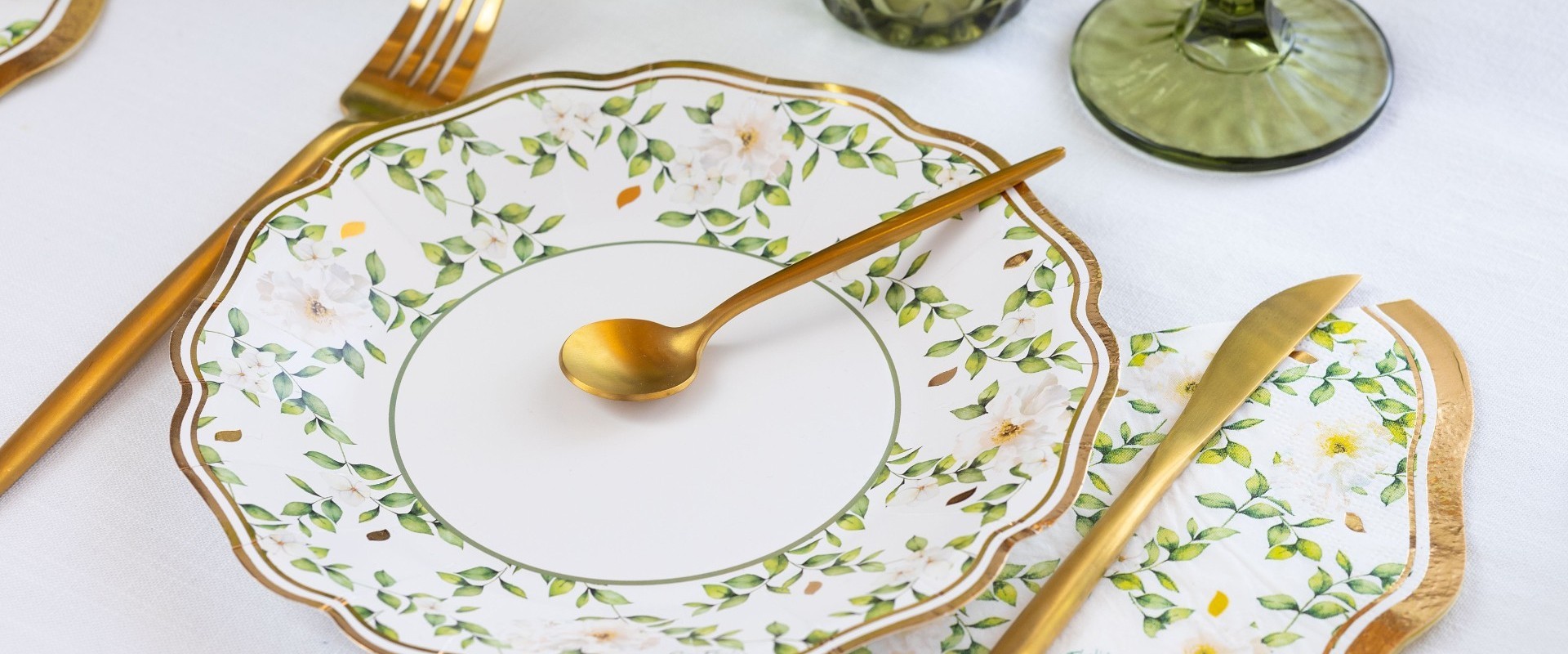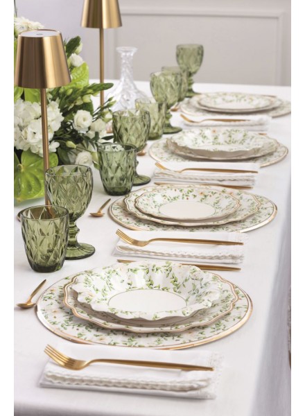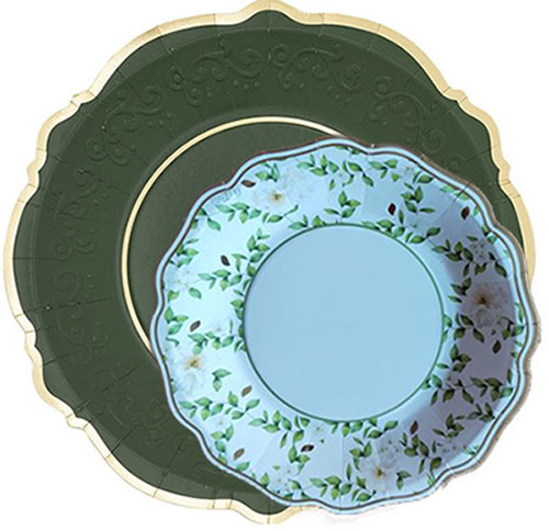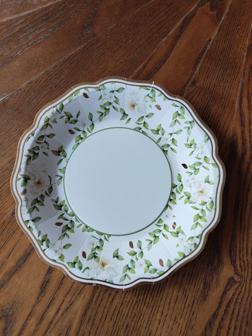 Plato estampado Camelia con flores en tonos verdes y filo dorado fabricado en cartón de alto gramaje. Disponible en tamaño de postre, de 21 cm. de diámetro. Combinan muy bien con los platos verde y dorados. Diseño moderno y original muy indicado para comuniones y cumpleaños de chicas. Se venden en paquetes de 8 unidades. Diseño italiano