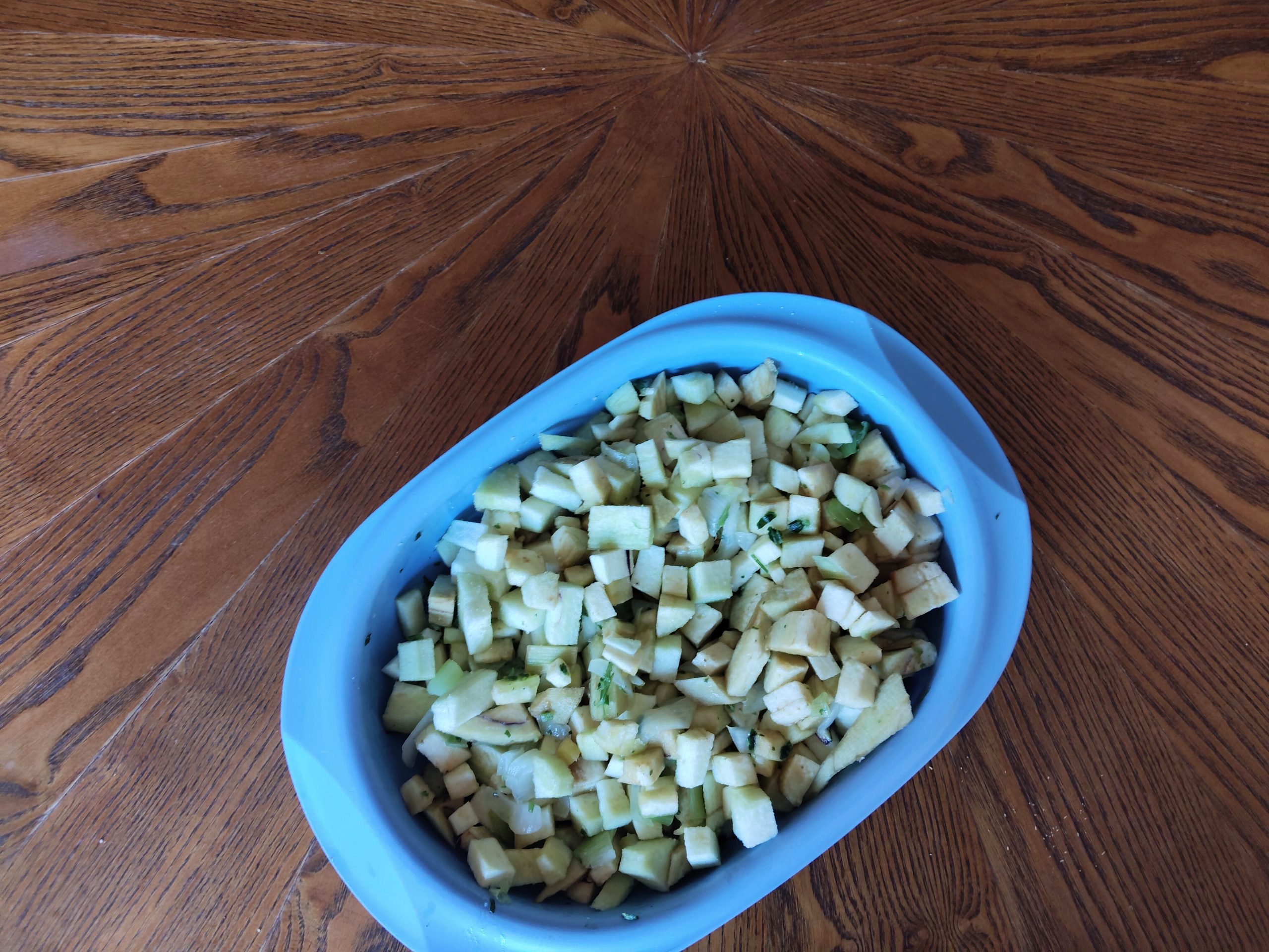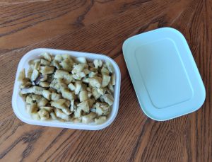 Así, en un tupperware apto para ello (en mi caso, ultra pro) cocino por 2 minutos cebolleta, ajo y perejil picados junto a un poco de aceite. Después, se añaden las berenjenas cortadas en cuadritos, a las que se añade sal, y se cocinan por 10 minutos aproximadamente. El resultado es una textura y sabor estupendos para poder mezclarlo con unos huevos batidos y cuajar una tortilla en la sartén. La berenjena queda blandísima y con mucho sabor, que se lo proporcionan las hojas previamente pochadas.