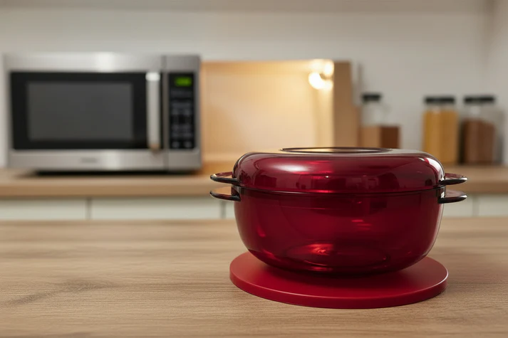 olla micro Cook o microplus fabricada por tupperware en un material resistente que la hace apta para cocinar en el microondas.