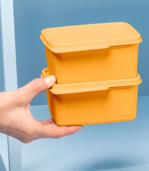 Set cajas cuadradas tupperware con capacidad de 500 ml. fabricadas en plástico libre de bisfenol, adecuadas para conservar alimentos crudos en el frigorífico o secos en despensa. No apto para congelador ni microondas. Dos unidades en color naranja.
