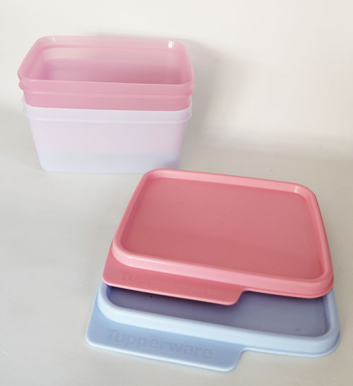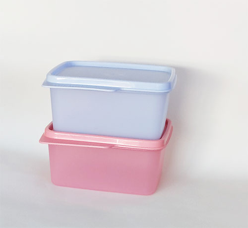 Set cajas cuadradas tupperware con capacidad de 500 ml. fabricadas en plástico libre de bisfenol, adecuadas para conservar alimentos crudos en el frigorífico o secos en despensa. No apto para congelador ni microondas. Dos unidades en colores rosa y azul claro.