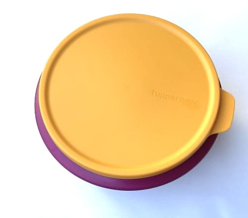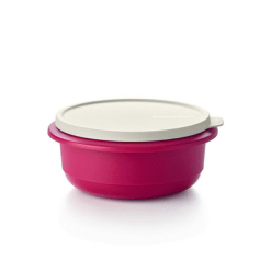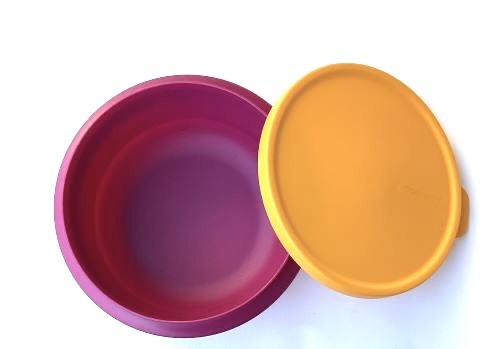 Tazón mezclador rosa con tapa amarilla de la reconocida marca tupperware fabricado en plástico libre de bisfenol. Es hermético al aire y a los líquidos. Tiene una capacidad de 1 litro. y dispone de señal de medida en su interior. Una vez cerrado, se presiona en el centro abriendo por la lengueta para expulsar el aire y hacer el vacío. Es apropiado para guardar comida cocinada, no cruda. No apto microondas ni congelador. También apto para despensa. Medidas: 8,4 cm – ∅ 17,8 cm. A todo los recipientes redondos se les puede hacer el vacío una vez cerrado, levantando simultáneamente la lengueta y presionando en el centro para expulsar el aire. Se oye perfectamente. Con ello conseguimos que los alimentos cocinados aumenten su tiempo de conservación en óptimas condiciones durante varios días.