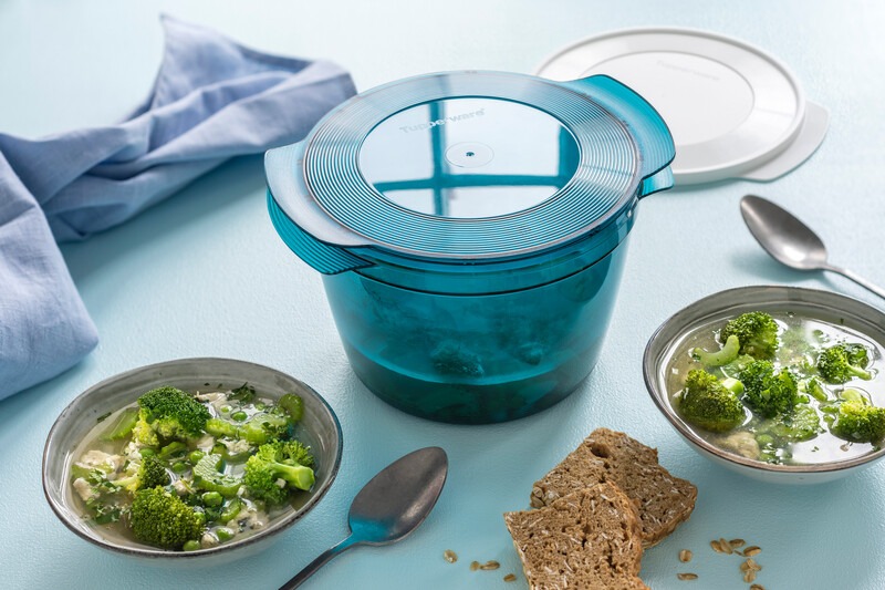Olla micro Cook fabricada por tupperware en un material ultra ligero y resistente que la hace apta para cocinar en el microondas. Dispone de dos tapas, una para cocinar y otra de color blanco (sello hermético que permite conservar, transportar y congelar). A todos los recipientes redondos se les puede hacer el vacío levantando simultáneamente la lengueta y presionando en el centro para expulsar el aire. Se oye perfectamente. Con ello conseguimos que los alimentos cocinados aumenten su tiempo de conservación en perfectas condiciones durante varios días.